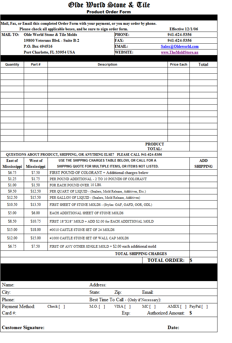 THERE IS A MINIMUM ORDER OF $10.00 - NOT INCLUDING SHIPPING, WHEN USING A CREDIT CARD. MAIL IN ORDER FORM Cobblestone | Brick Veneer | Tile - 12x12 | Tile - Smaller | Tile - Trim | Customized Tile Large Format | Mold Catalogue | Sealers Colors | Order Form Mold Facts | Photo Gallery | DIY Packages | Introduction | Useful Links © 2014 themoldstore.com. All Rights Reserved |